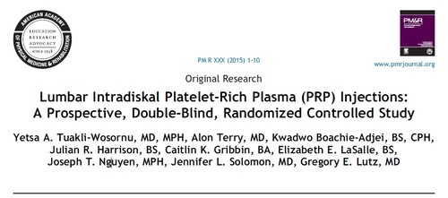 文獻:Lumbar Intradiskal Platelet-Rich Plasma (PRP) Injections: A Prospective, Double-Blind, Randomized Controlled Study https://pubmed.ncbi.nlm.nih.gov/26314234/